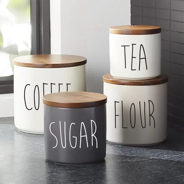White kitchen canisters with black lettering alphabet fonts bubble.